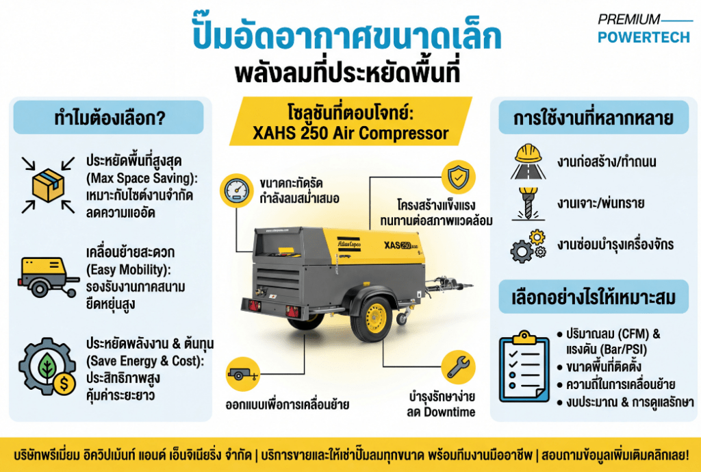 บทความนี้จะพาคุณไปรู้จักข้อดีของปั๊มอัดอากาศขนาดเล็ก พร้อมแนะนำโซลูชันที่ตอบโจทย์การใช้งานจริงอย่าง XAHS 250 Air Compressor ที่ออกแบบมาเพื่อความคล่องตัว ประสิทธิภาพสูง และการประหยัดพื้นที่อย่างแท้จริง